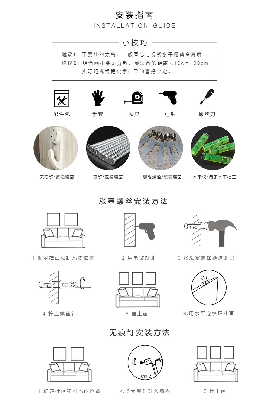 配件:無痕釘1個,一次性手套一幅,水平儀一個,鋼釘1個